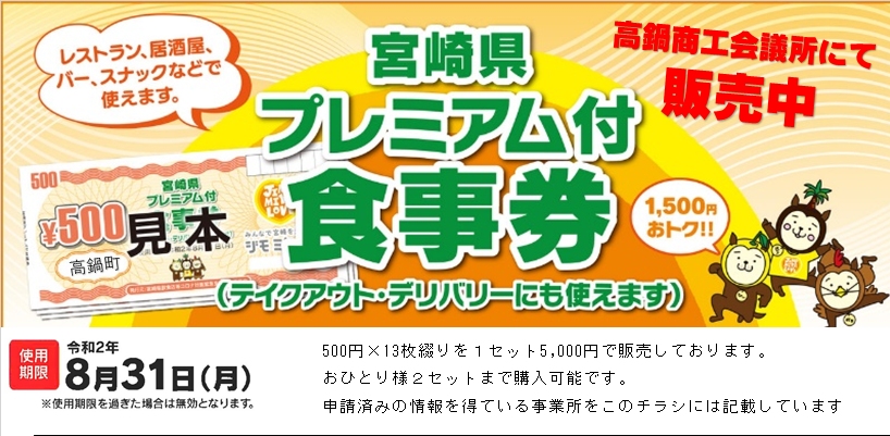 新型コロナウイルス感染症の感染拡大により影響を受けた飲食店を支援するため、「宮崎県プレミアム付食事券(以下「食事券」という。)」を発行します。