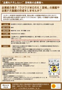 宮崎県ではUIJターン希望者や新規学卒者等、県内企業への就職を希望される方に向けて、県内企業の魅力を発信する冊子「ワクワクWORK!宮崎」への掲載や企業PR動画を作成する企業を募集します。