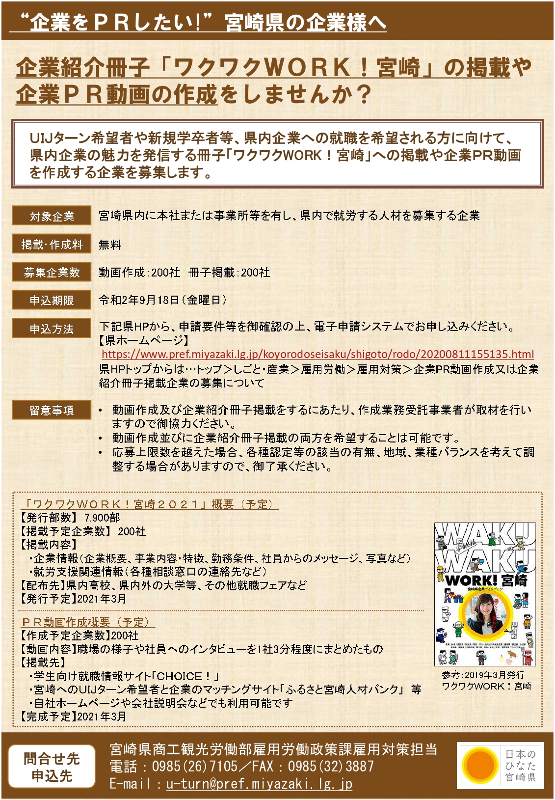 宮崎県ではUIJターン希望者や新規学卒者等、県内企業への就職を希望される方に向けて、県内企業の魅力を発信する冊子「ワクワクWORK!宮崎」への掲載や企業PR動画を作成する企業を募集します。