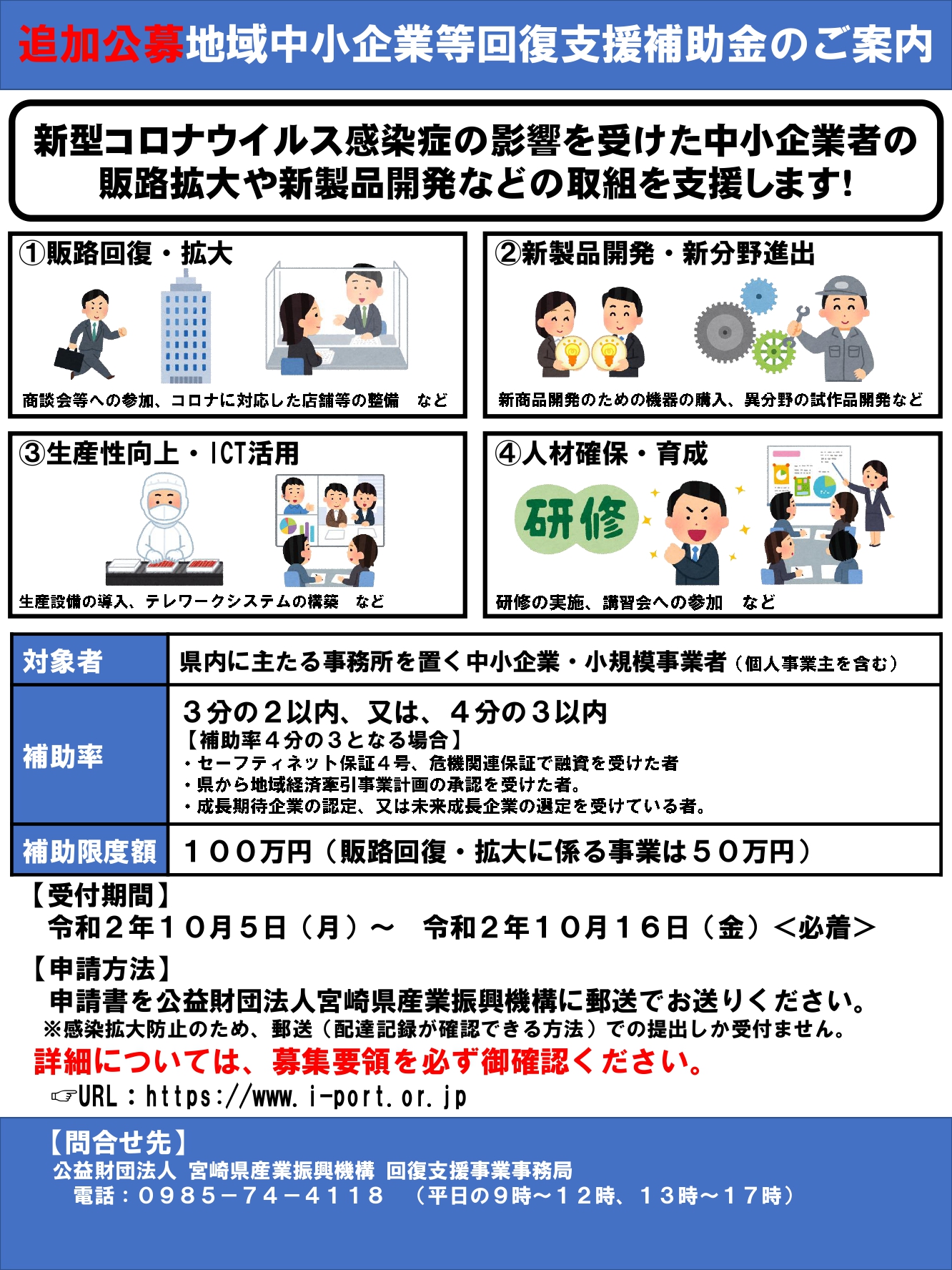 新型コロナウイルス感染症の影響を受けた中小企業者の販路拡大や新製品開発などの取組を支援する地域中小企業等回復支援補助金の追加募集を実施します。申請できる方や対象となる取組・経費などの要件がございますので、別添の「募集要領」や「申請の手引き」を参照いただき、指定の様式にて申請してください。