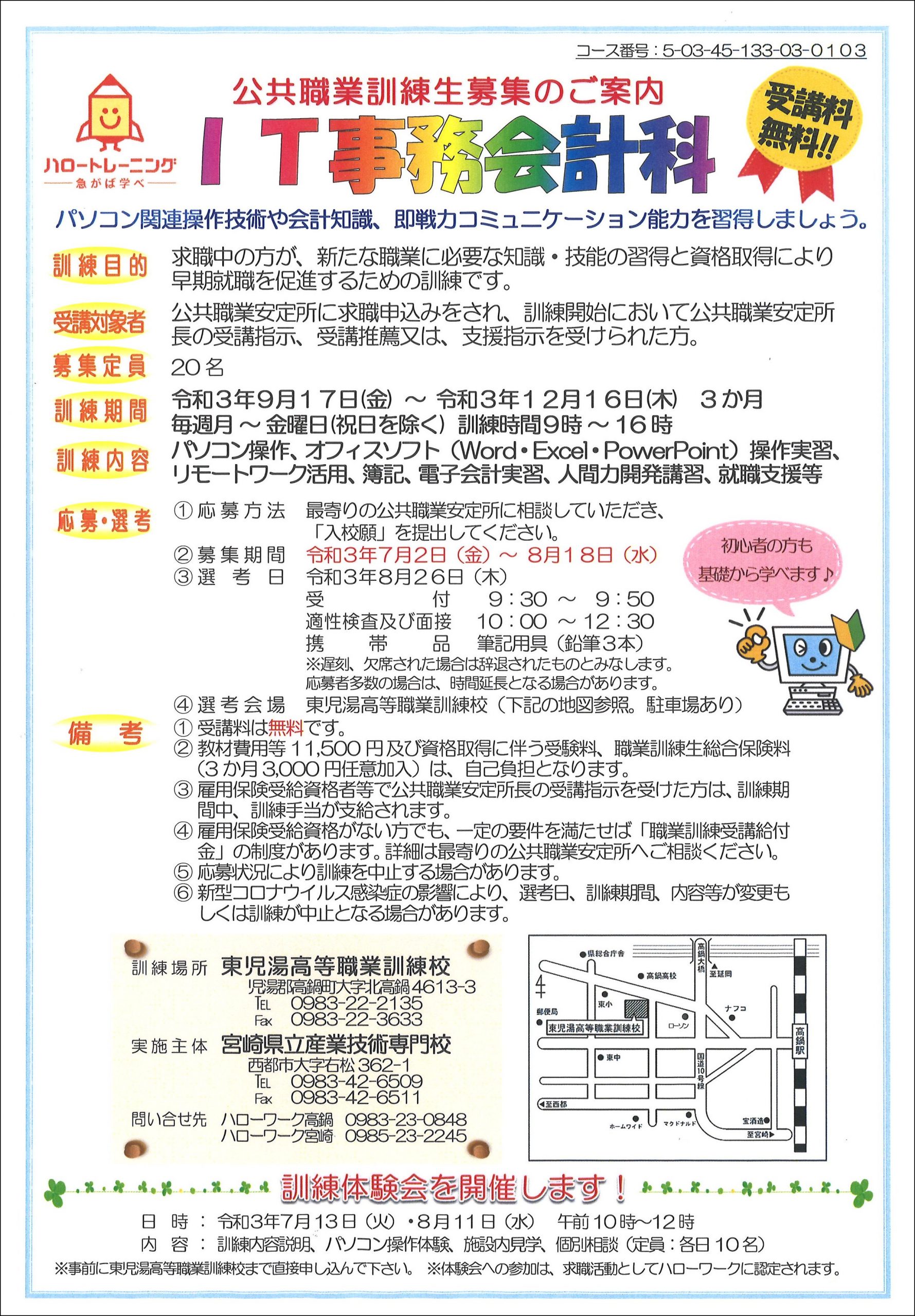 相談・お申し込みはハローワークまで、訓練の詳しい内容は東児湯高等職業訓練校までお問い合わせください。