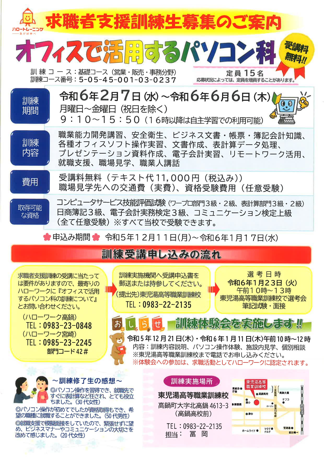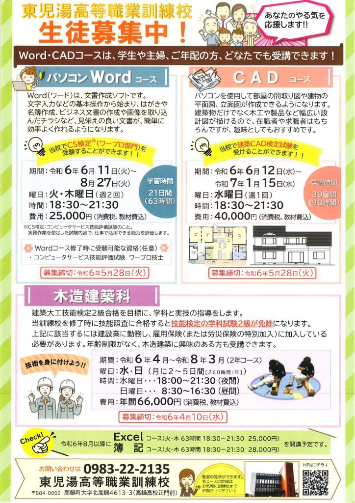 東児湯高等職業訓練校さんから生徒募集のご案内です! 下記以外にも、シーズン毎に多種多様な講習を実施しております。 まずは 気軽にお問い合わせを! 東児湯高等職業訓練校ホームページ(高鍋高校正門前) TEL.0983-22-2135