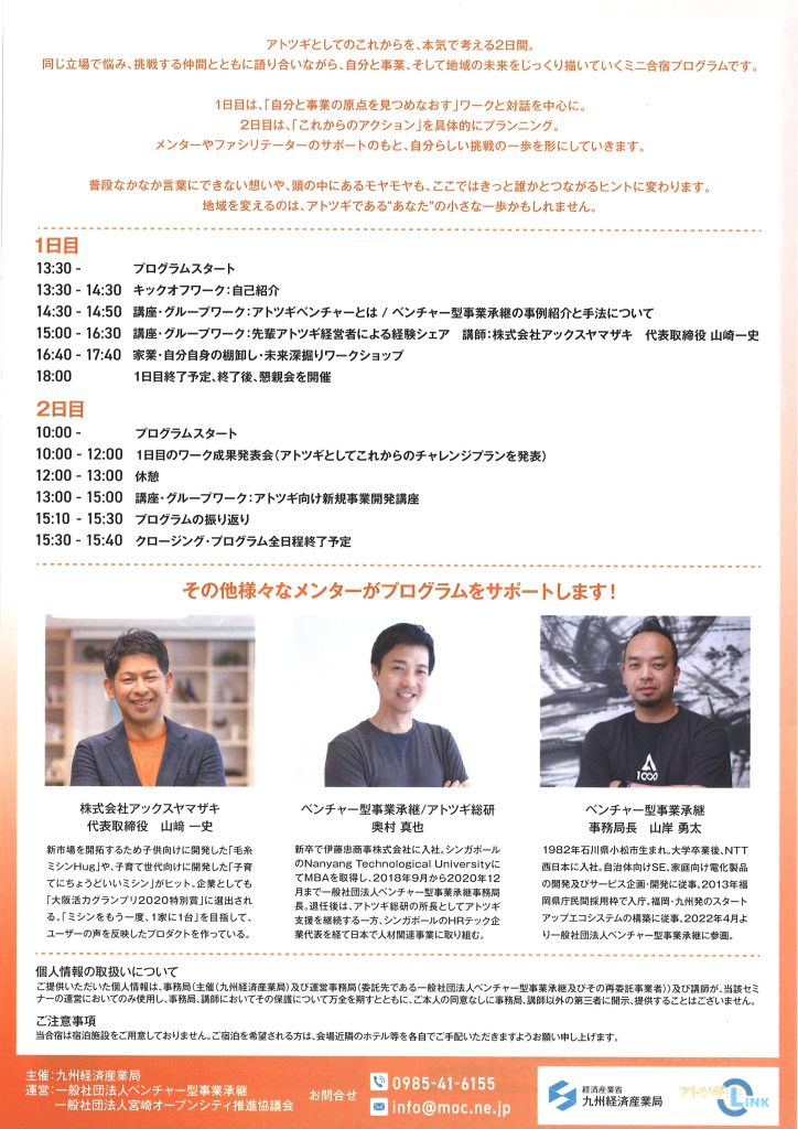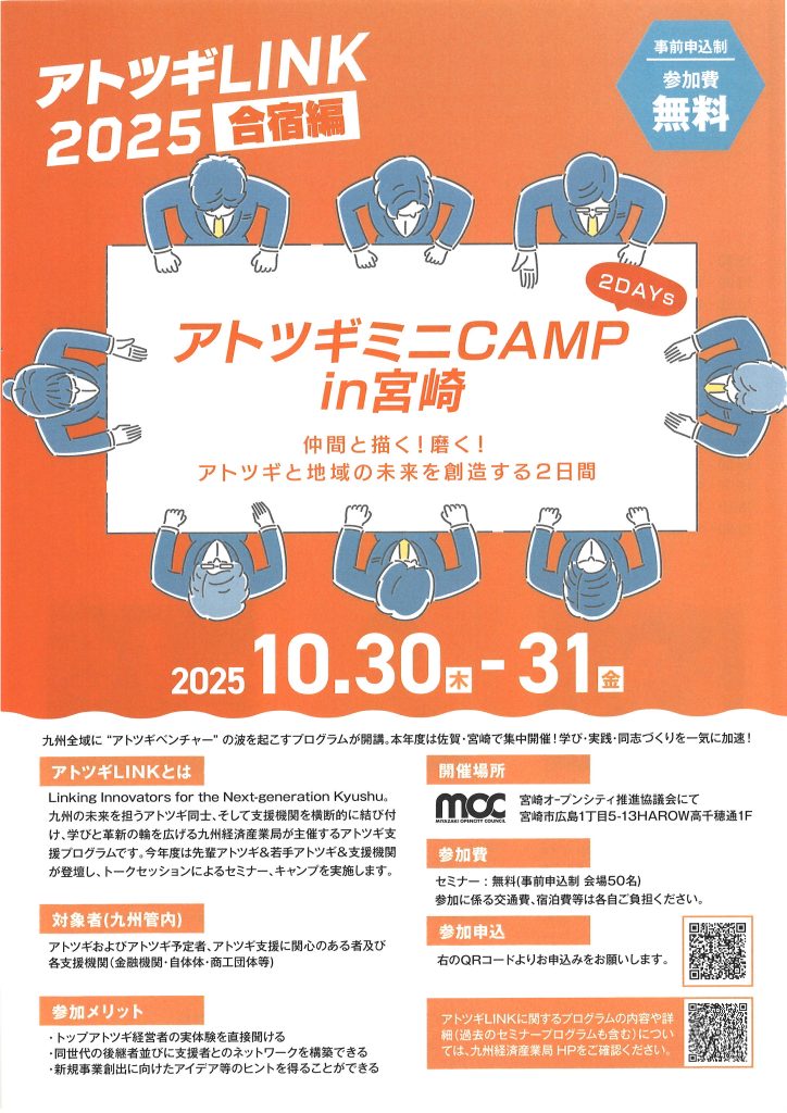 九州の未来を担うアトツギ動詞、そして支援機関を横断的に結び付け、学びと革新の輪を広げる九州経済産業局が主催するアトツギ支援プログラムです。今回は先輩アトツギ&若手アトツギ&支援機関が登壇し、トークセッションによるセミナー、キャンプを実施します。