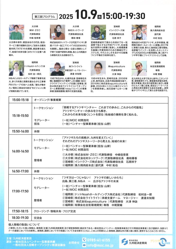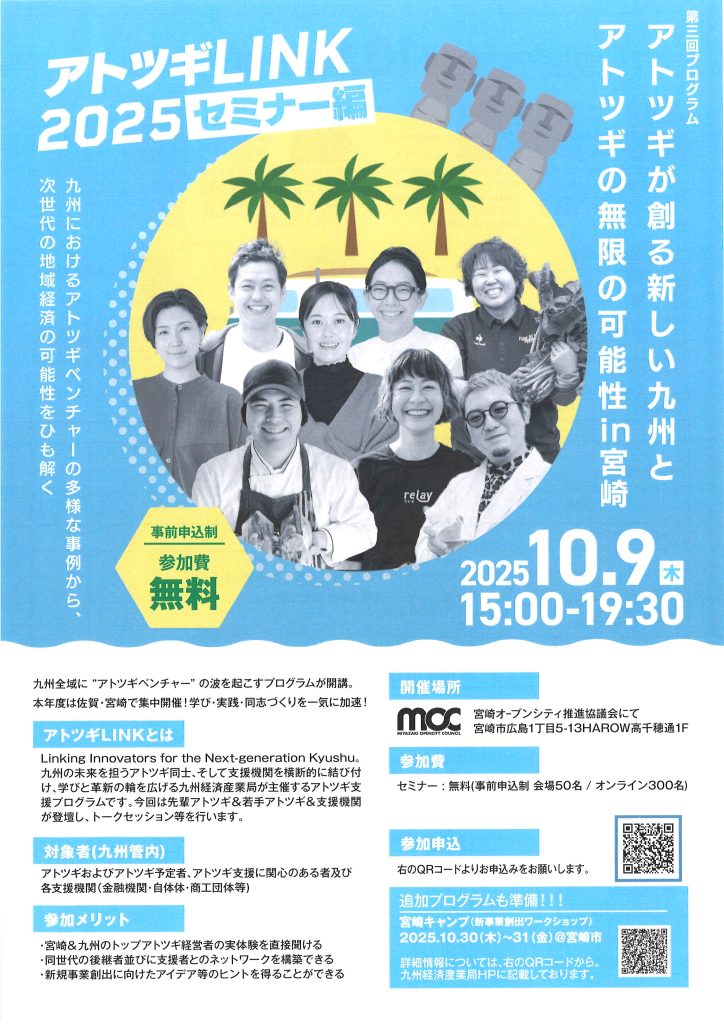九州の未来を担うアトツギ動詞、そして支援機関を横断的に結び付け、学びと革新の輪を広げる九州経済産業局が主催するアトツギ支援プログラムです。今回は先輩アトツギ&若手アトツギ&支援機関が登壇し、トークセッションを行います。