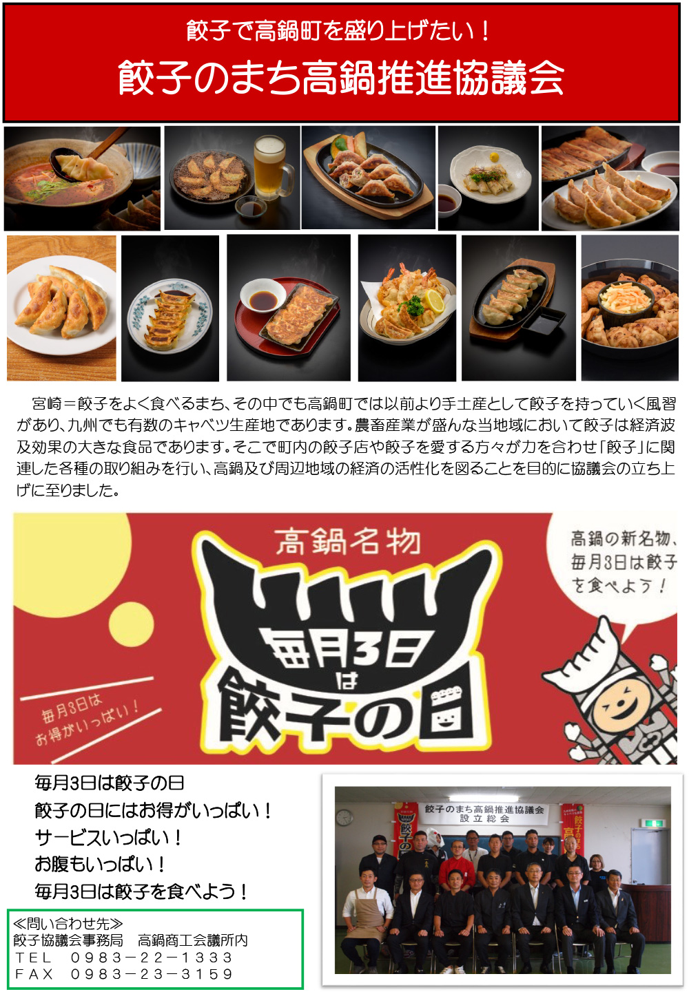 そこで町内の餃子店や餃子を愛する方々が力を合わせ「餃子」に関連した各種の取り組みを行い、高鍋及び周辺地域の経済の活性化を図ることを目的に協議会の立ち上げに至りました。